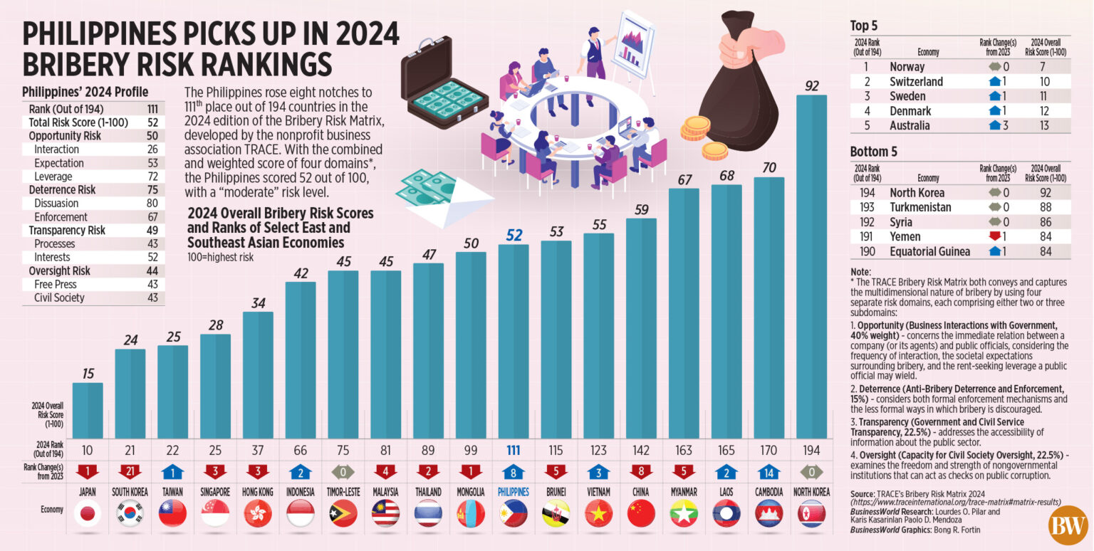 Manila climbed eight ranks to 111th out of 194 nations in the 2024 edition of the Bribery Risk Matrix published by TRACE, a nonprofit organization.