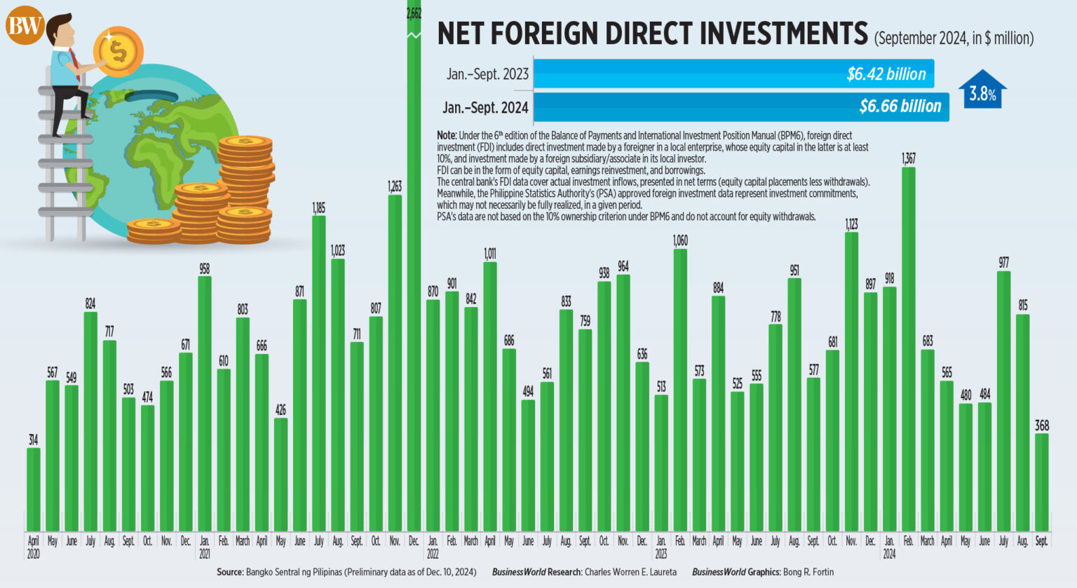 “The decline in FDI net inflows in September 2024 was mainly attributed to the decrease in nonresidents’ net investments in debt securities,” the BSP stated.