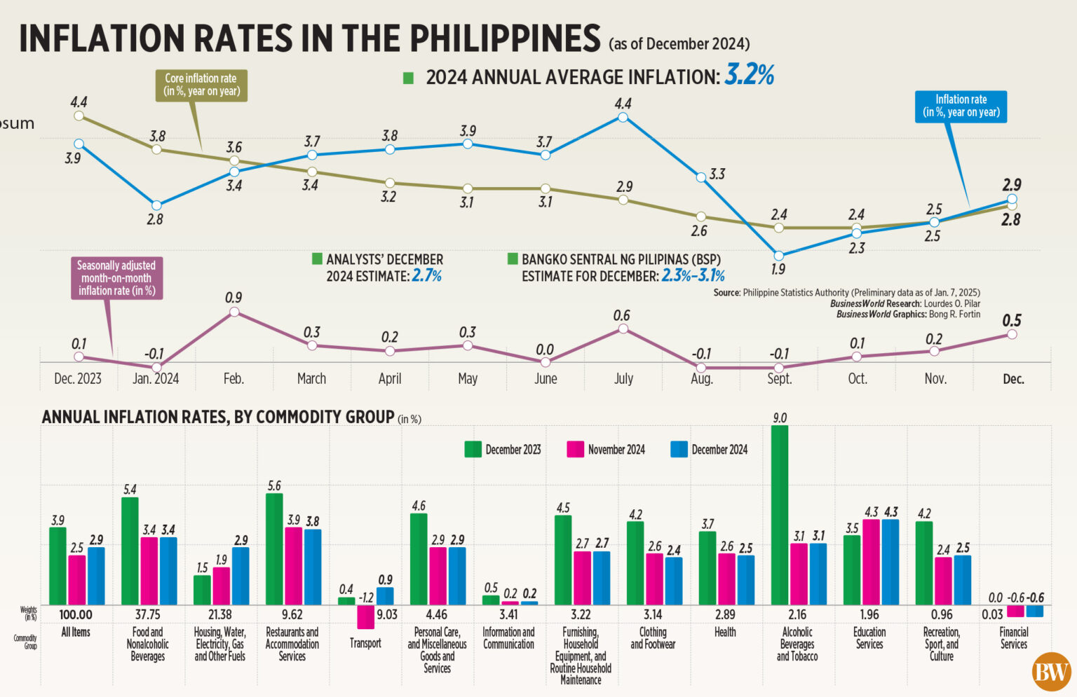 The December figure pushed the 2024 inflation rate to 3.2%, aligning with the BSP’s projections. This marked the first occasion since 2021 that the full-year inflation stayed within the central bank’s 2-4% target, when it averaged 3.9%. Additionally, it was the lowest since the 2.4% recorded in 2020.