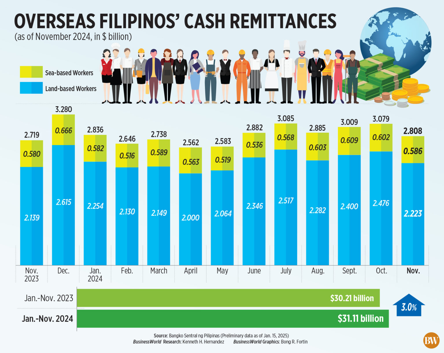BSP data revealed that remittances from land-based laborers surged by 3.9% year-on-year to $2.22 billion in November, while funds dispatched by sea-based workers slightly increased by 1% to $585.505 million.