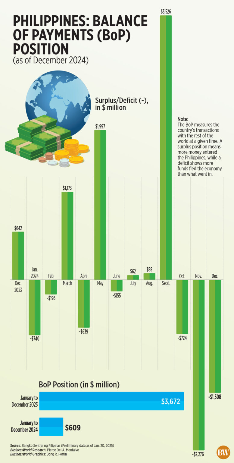 Data from the Bangko Sentral ng Pilipinas (BSP) indicated that the total BoP position recorded a surplus of $609 million last year, plummeting by 83.4% from the $3.672-billion surplus at the conclusion of 2023.