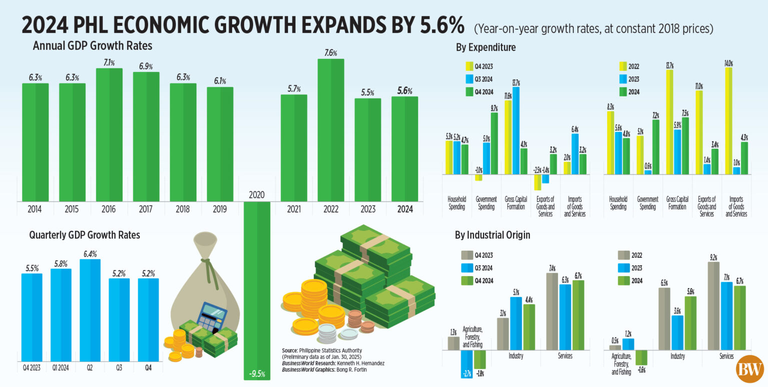 Annual growth registered at 5.6%, below the adjusted target of 6-6.5%, and the 5.7% median forecast in a BusinessWorld survey. The GDP increase for 2024 was slightly above 5.5% from 2023.