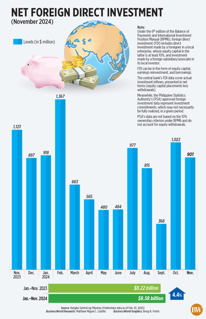 FDI net inflows declined by 19.8% to $901 million in November compared to $1.12 billion in the same month last year, according to the Bangko Sentral ng Pilipinas (BSP) on Monday.