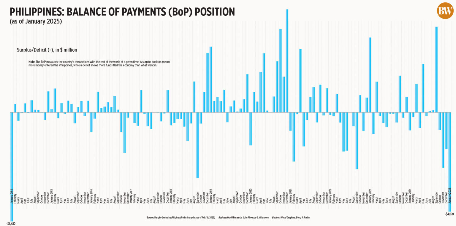 “The BoP deficit in January 2025 resulted from the BSP’s net foreign exchange activities and withdrawals by the National Government (NG) from its foreign currency reserves with the BSP to fulfill its external debt responsibilities,” the central bank stated.