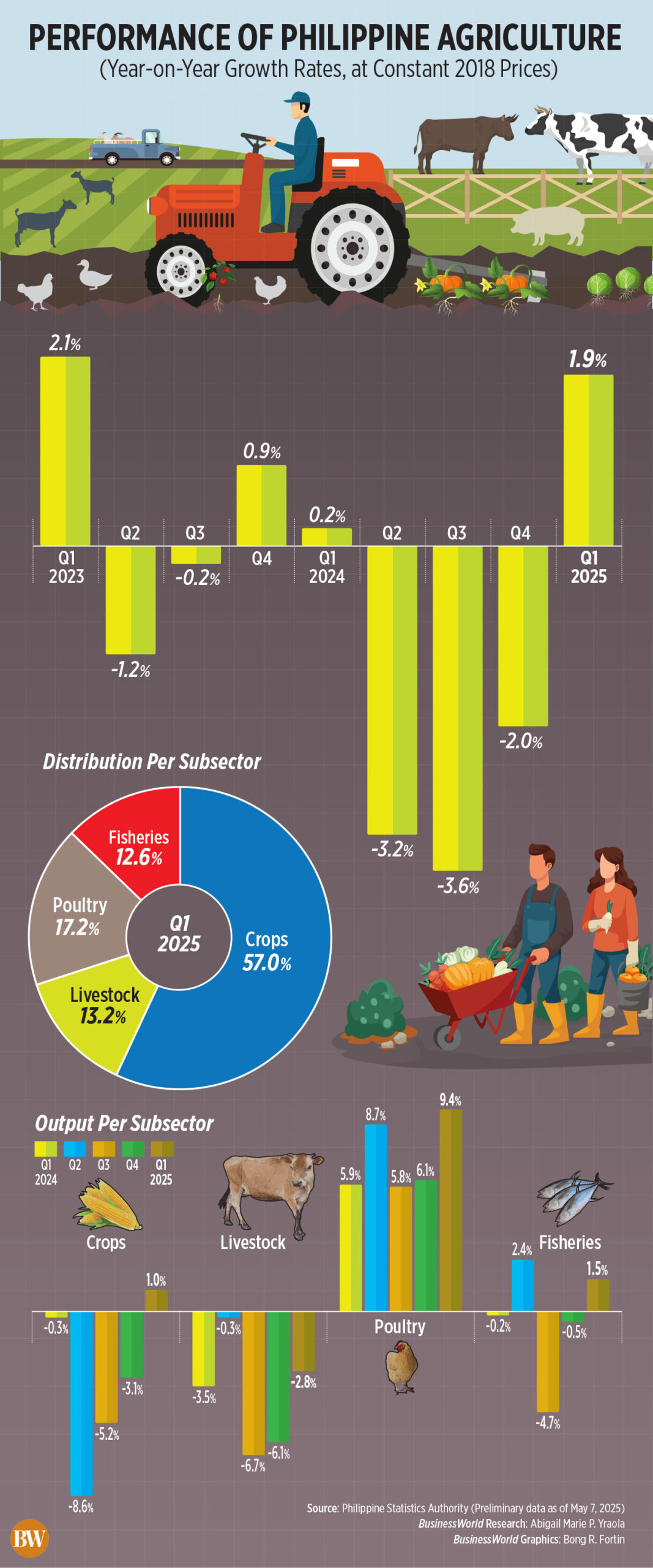 AGRICULTURAL OUTPUT increased by an annual 1.9% during the initial quarter, as favorable weather conditions contributed to enhanced crops, fisheries, and poultry production, according to the Philippine Statistics Authority (PSA).