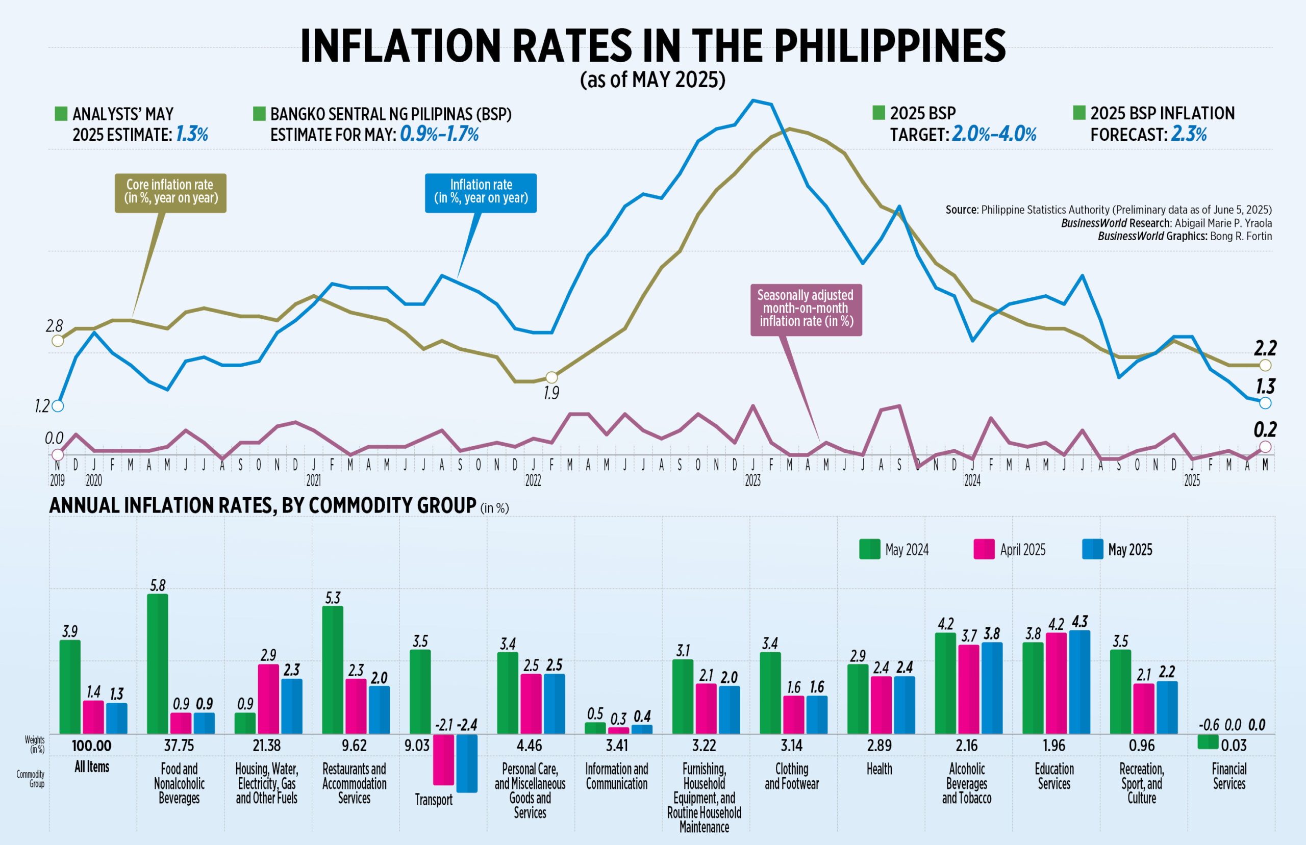 The consumer price index (CPI) increased to 1.3% in May, a decrease from 1.4% in April and 3.9% for the same month last year, preliminary data from the PSA indicated.