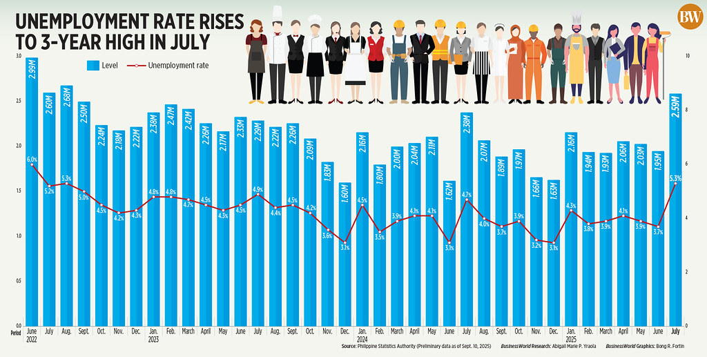 The number of unemployed Filipinos rose to 2.59 million in July from 2.38 million a year earlier and 1.95 million in June, initial data from the Philippine Statistics Authority’s (PSA) labor force survey indicated.