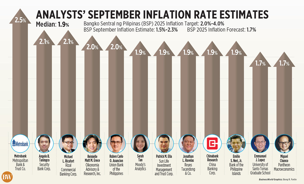 A BusinessWorld survey of 12 analysts yielded a median prediction of 1.9% for September inflation, falling within the Bangko Sentral ng Pilipinas’ (BSP) 1.5-2.3% projection for the month.