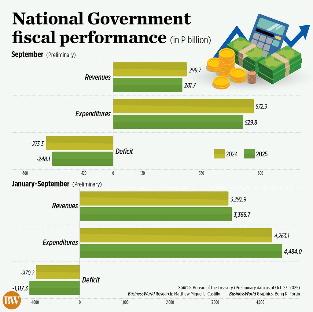 THE Philippines’ budget shortfall declined in September, the Bureau of the Treasury (BTr) announced on Thursday, as investigations into flood control schemes restrained government expenditures.